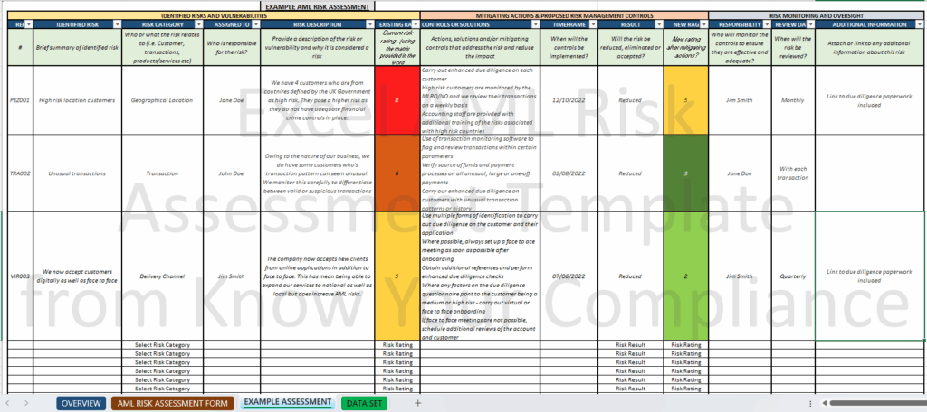 If you would prefer to buy a ready to use set of templates for completing an anti money laundering risk assessment, we have what you need. From just £15 (exc vat) our AML risk assessment template comes with a 19-page customisable procedures document, a pre-defined risk matrix and a ready to use AML risk assessment template in Excel. We have provided all stages of the AML risk assessment so that you can follow them in your business. We have also included a sample completed template to guide you.