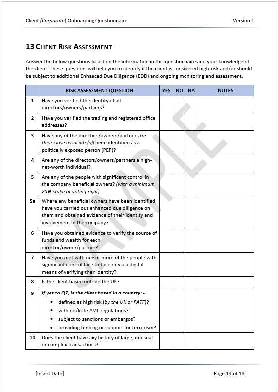 - Includes 20+ client risk assessment questions to identify high-risk clients and comply with the Money Laundering Regulations.