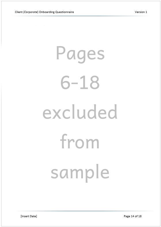 With our 15-page corporate and individual onboarding questionnaires, you can complete the onboarding process with ease or ask you client to fill out the forms themselves. Includes client risk assessment questions to determine if standard or enhanced due diligence is required.