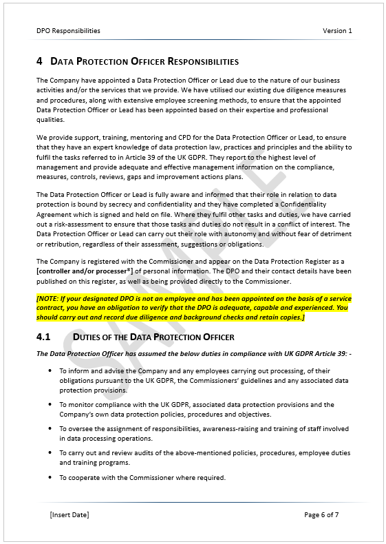 The DPO responsibilities template aids compliance with UK GDPR Articles 37-39. If a business is required to appoint a data protection officer, they must also document this persons responsibilities and duties. This professional, complint template means you don’t need to start from scratch when complying with your DPO obligations.