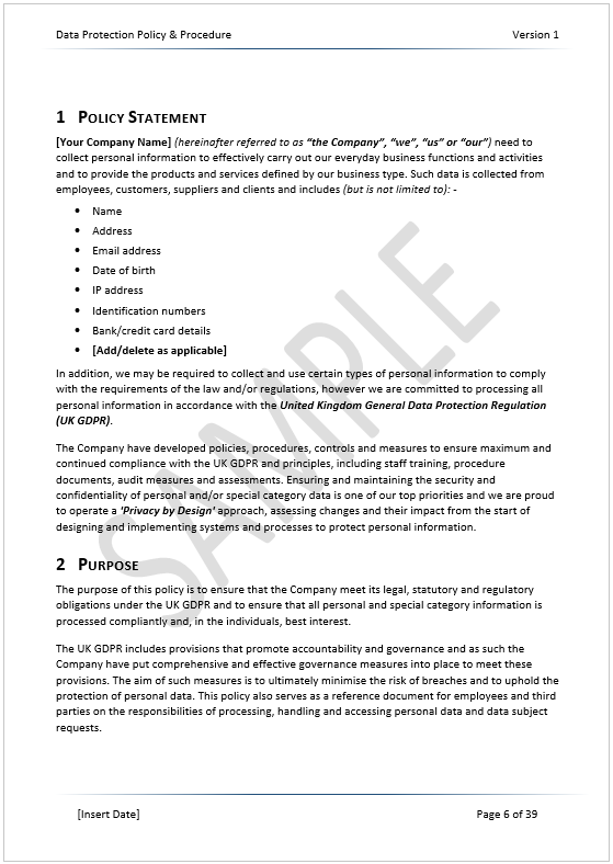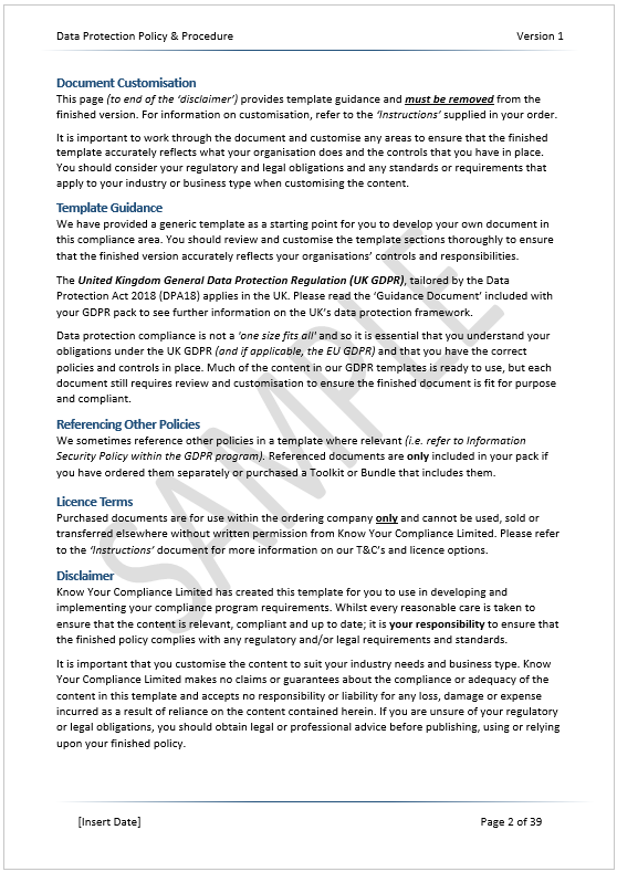NOTE: This is a standalone GDPR Data Protection Policy only and does not includetemplates for areas such as privacy notices, subject access requests, CCTV, retention or our GDPR checklist. Compare our GDPR Template Toolkitsfor discounted bundles.