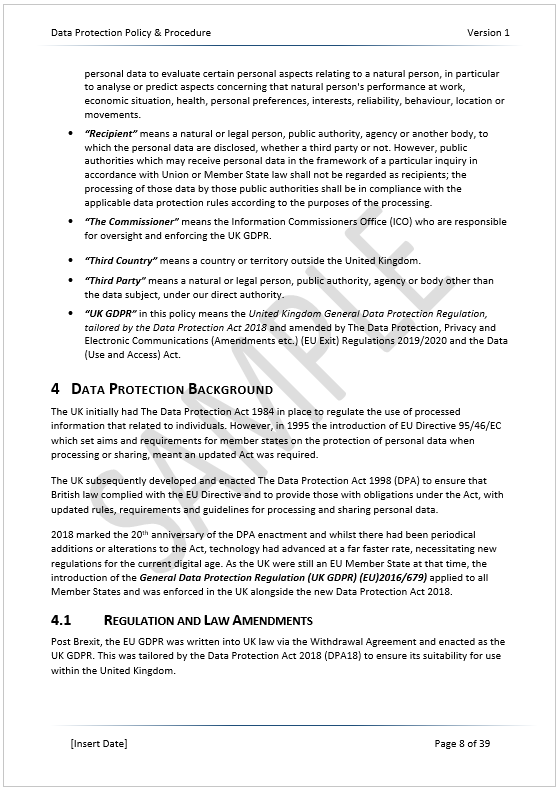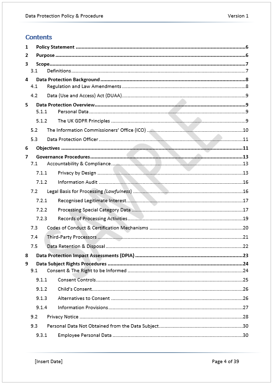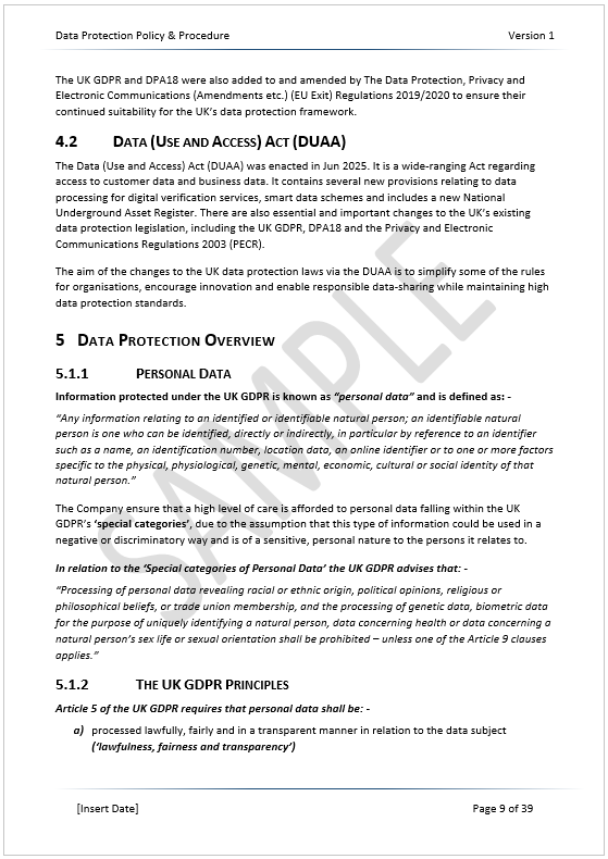 Our GDPR Data Protection Policy Template is a standalone policy that covers the main data protection requirements, including the latest Data (Use and Access) Act 2025 rules. Data protection compliance cannot be maintained in an 8-page policy! GDPR is a vast area that requires in-depth compliance. Our 38-page GDPR policy template aligns fully with the UK GDPR Articles and Recitals. It complies with the UK’s DPA18 and the ICO requirements. We have also included a free Excel Information Audit template to document your data processing channels and framework.