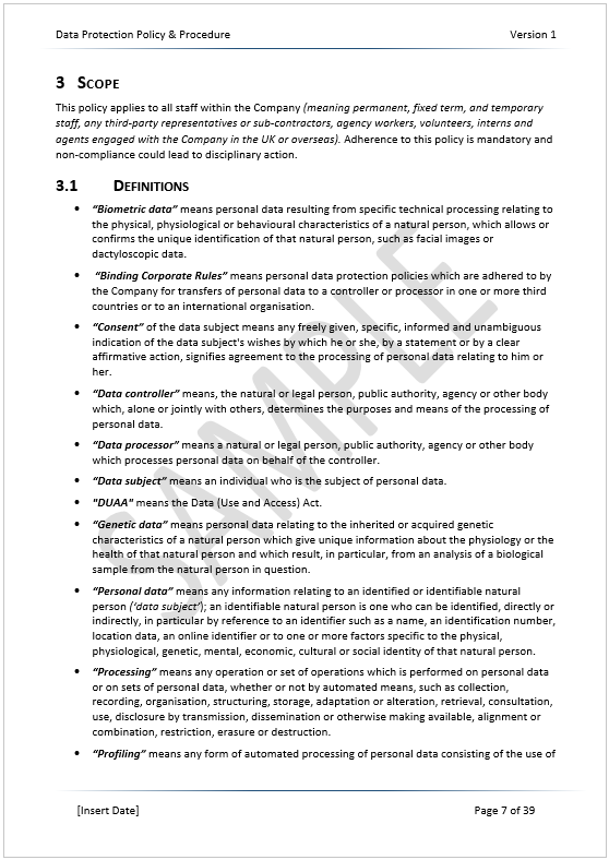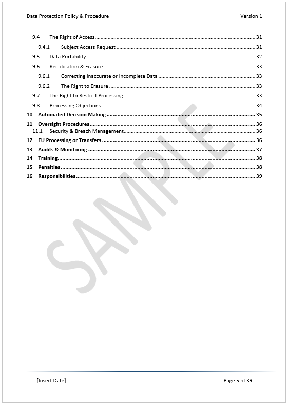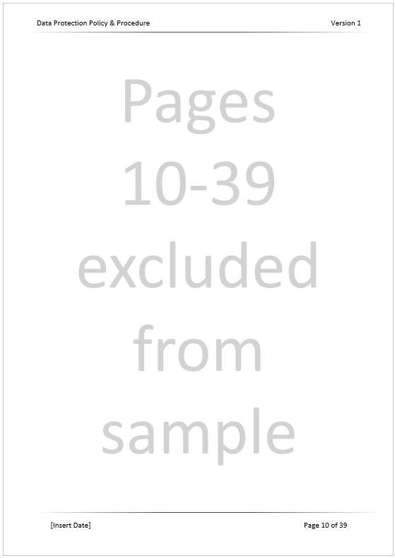 Below are some random sample pages from the 38-page GDPR Policy Template document. The pages do not follow on in context, but are provided to offer an example of the format, style and content you will receive when ordering from us.