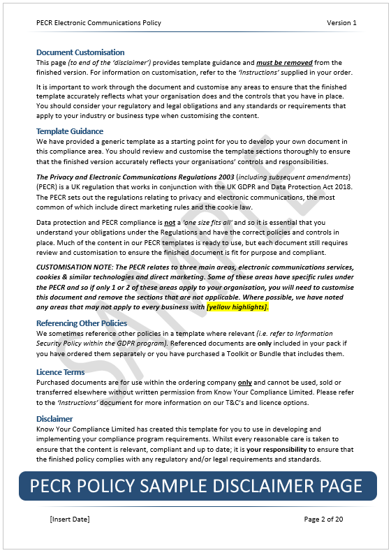 - Ready to use – you don’t need to reinvent the wheel with our PECR policy templates and tools. Ready to use content with just a few areas to edit or customise.